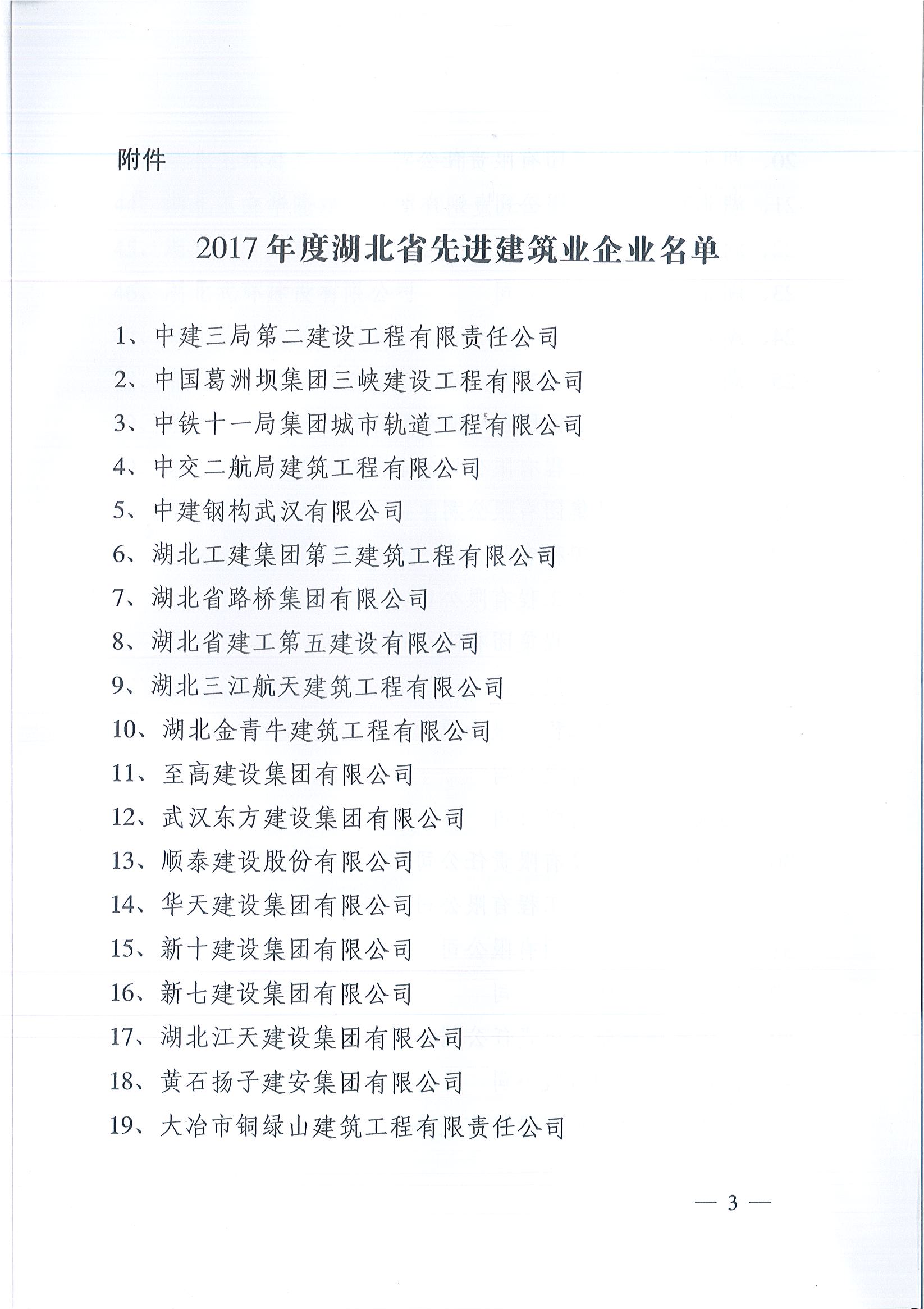 2017年度湖北省先進(jìn)建筑業(yè)企業(yè)名單